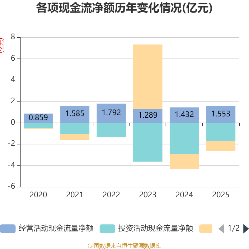 截至2025年,公司经营活动现金流净额为1.55亿元,同比增长8.48%;筹资活动现金流净额-9231.82万元,同比增加4736.27万元;投资活动现金流净额-1.72亿元,上年同期为-2.95亿元。
