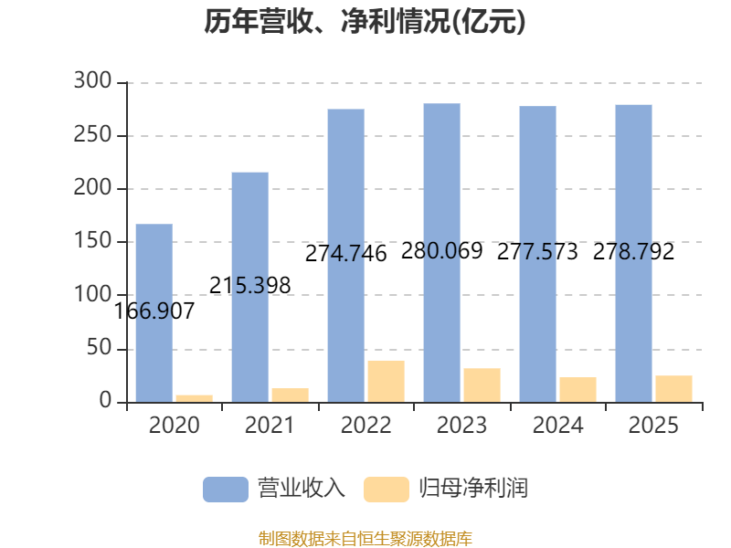 中证智能财讯阜丰集团(00546)3月26日披露2025年度报告。报告期内,公司实现营业收入278.79亿元,同比增长0.44%;归母净利润24.65亿元,同比增长6.61%;据报告显示,阜丰集团基本每股收益为0.9833元,平均净资产收益率为13.2%。