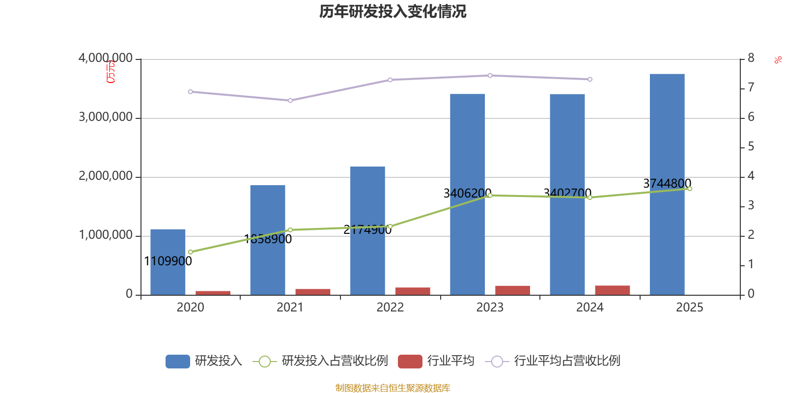 2025年全年,公司研发投入金额为374.48亿元,同比增长10.05%;研发投入占营业收入比例为3.6%,相比上年同期上升0.3个百分点。此外,公司全年研发投入资本化率为21.9%。
