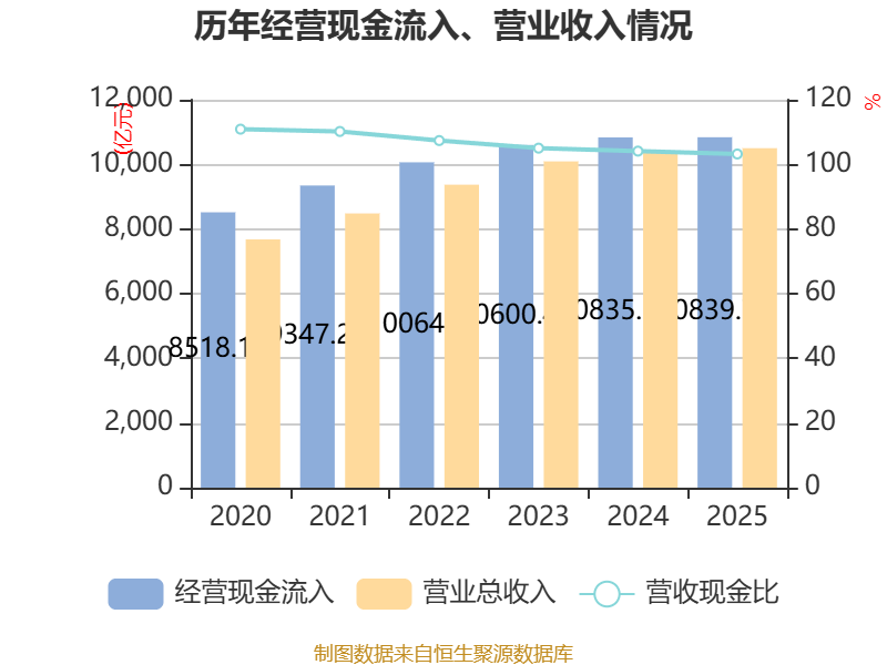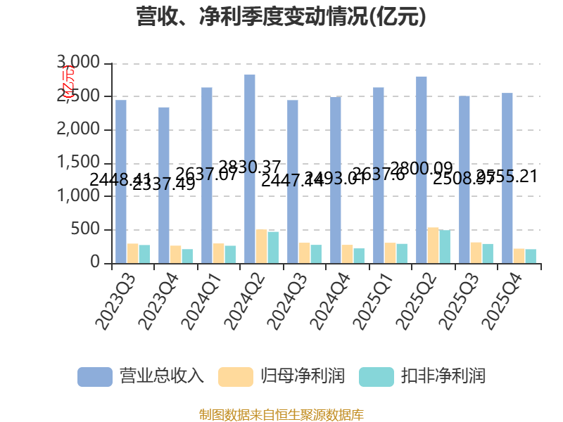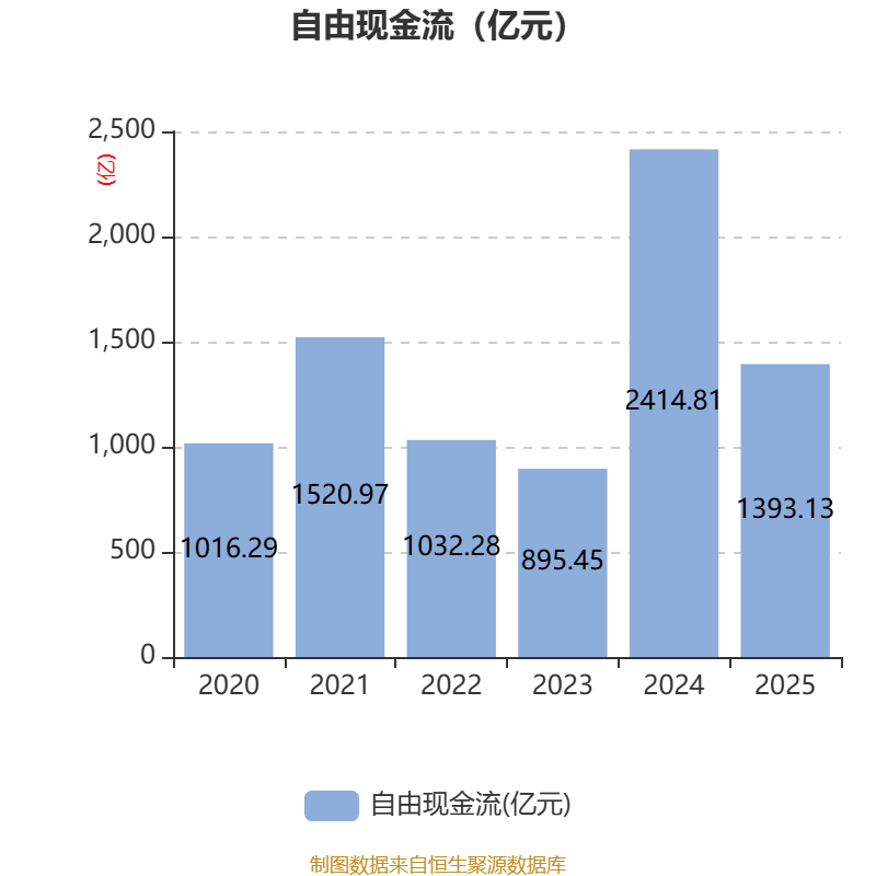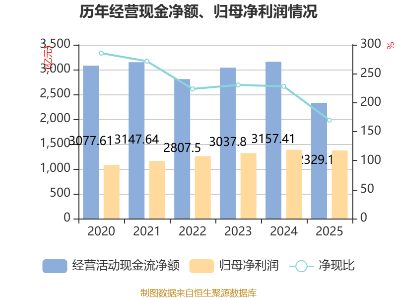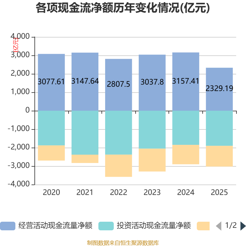 截至2025年,公司经营活动现金流净额为2329.19亿元,同比下降26.23%;筹资活动现金流净额-1121.43亿元,同比减少69.76亿元;投资活动现金流净额-1904.03亿元,上年同期为-1851.94亿元。