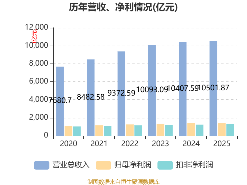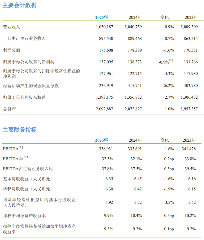 中证智能财讯中国移动(600941)3月27日披露2025年年度报告。2025年,公司实现营业总收入10501.87亿元,同比增长0.91%;归母净利润1370.95亿元,同比下降0.92%;扣非净利润1279.61亿元,同比增长4.27%;经营活动产生的现金流量净额为2329.19亿元,同比下降26.23%;报告期内,中国移动基本每股收益为6.35元,加权平均净资产收益率为9.90%。