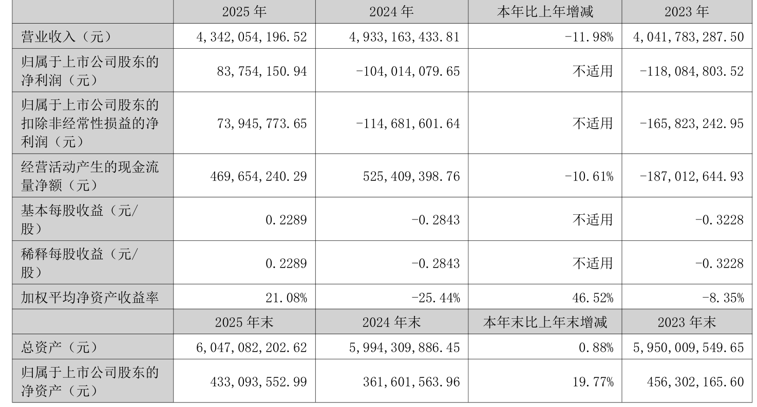 中证智能财讯中水渔业(000798)3月27日披露2025年年度报告。2025年,公司实现营业总收入43.42亿元,同比下降11.98%;归母净利润8375.42万元,同比扭亏;扣非净利润7394.58万元,同比扭亏;经营活动产生的现金流量净额为4.7亿元,同比下降10.61%;报告期内,中水渔业基本每股收益为0.2289元,加权平均净资产收益率为21.08%。
