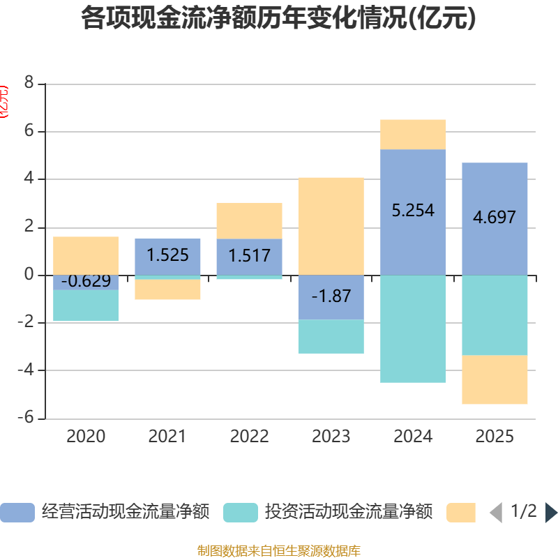 截至2025年,公司经营活动现金流净额为4.7亿元,同比下降10.61%;筹资活动现金流净额-2.03亿元,同比减少3.28亿元;投资活动现金流净额-3.36亿元,上年同期为-4.5亿元。