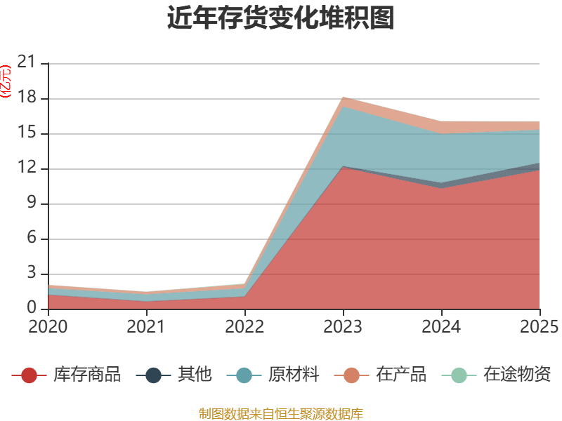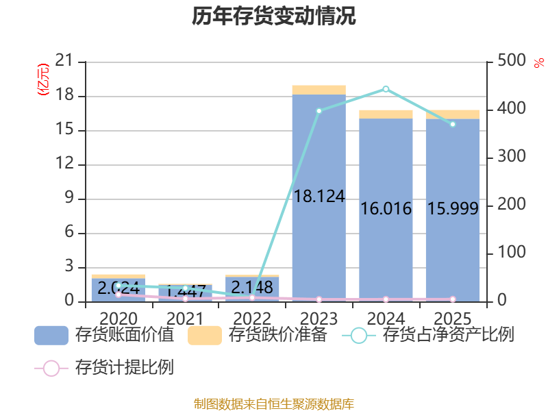 从存货变动来看,截至2025年末,公司存货账面价值为16亿元,占净资产的369.41%,较上年末减少173.85万元。其中,存货跌价准备为7655.14万元,计提比例为4.57%。