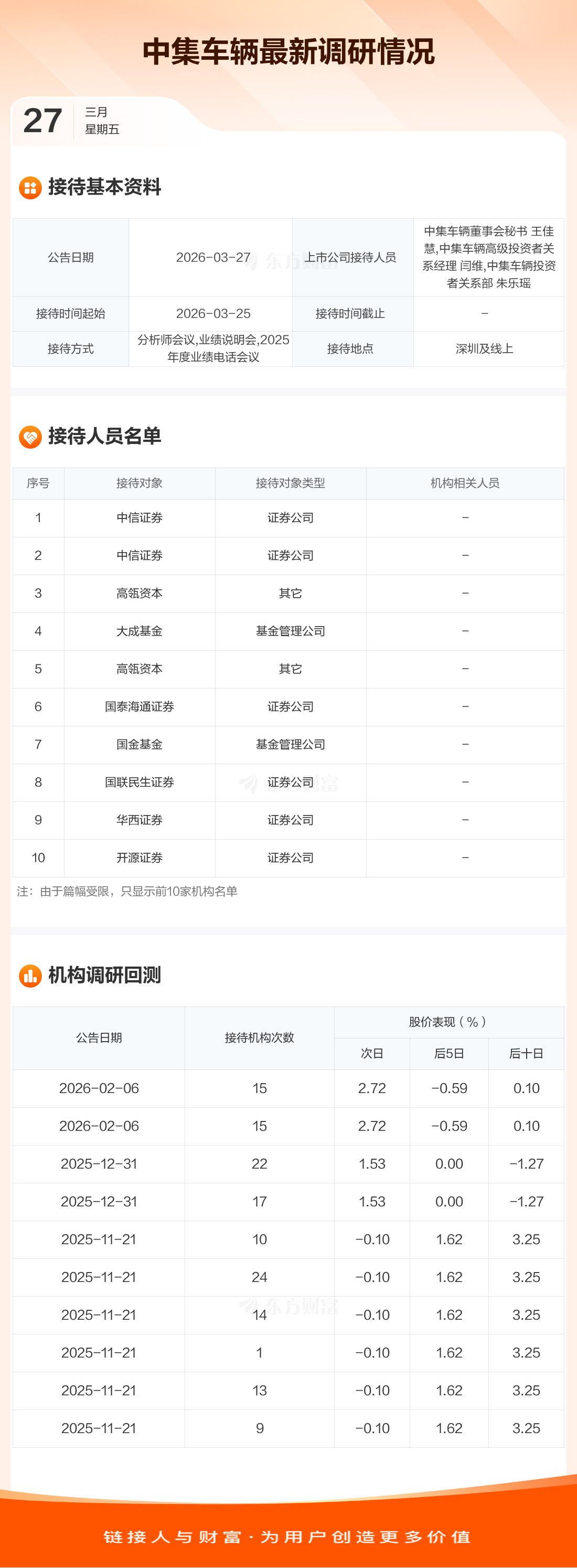 中集车辆3月27日公告称,3月25日接待中信证券等46家机构调研。接待人员包括中集车辆董事会秘书 王佳慧,中集车辆高级投资者关系经理 闫维,中集车辆投资者关系部 朱乐瑶。
