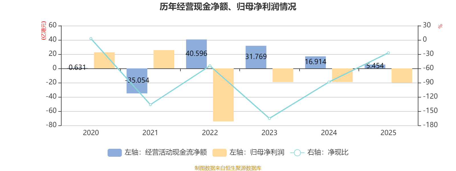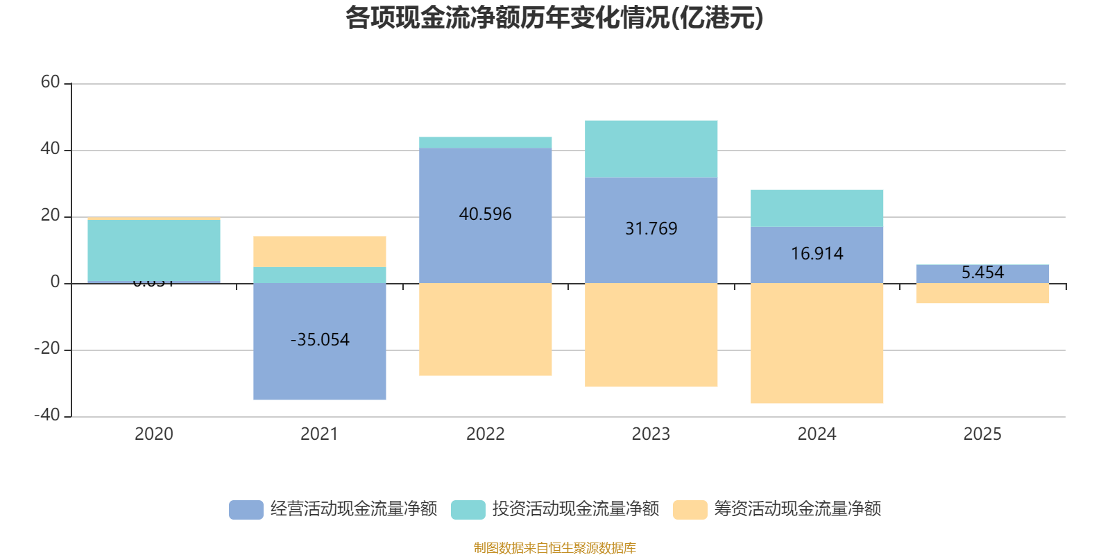 2025年,公司经营活动现金流净额为5.45亿港元,同比下降67.76%;筹资活动现金流净额-6.07亿港元,同比增加30.05亿港元;投资活动现金流净额1295.6万港元,上年同期为11.06亿港元。