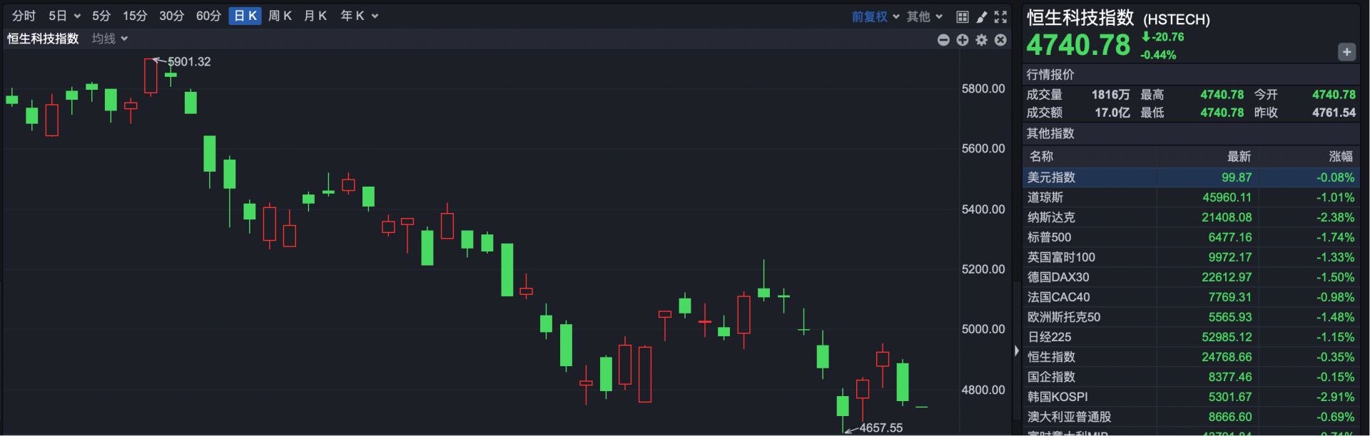 恒生科技指数开盘报4740.78点,下跌20.76点,跌幅0.44%。