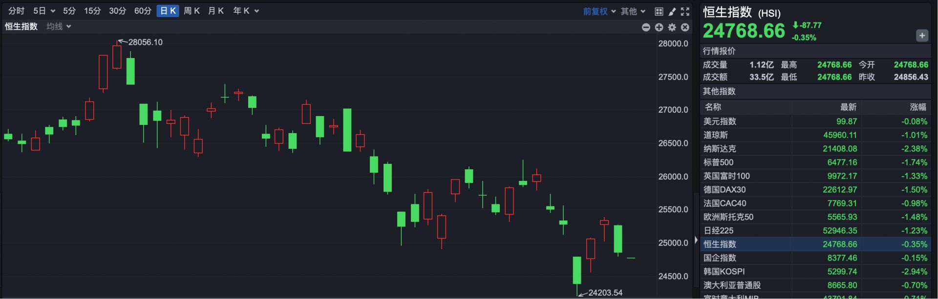 截至发稿,恒生指数开盘报24768.66点,下跌87.77点,跌幅0.35%。