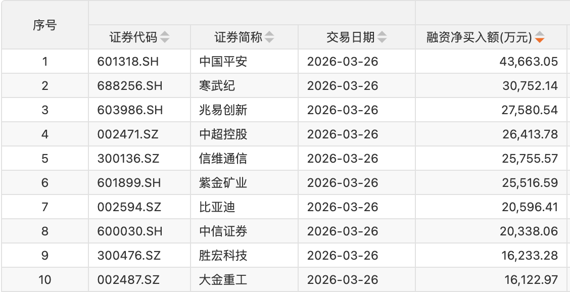 个股方面,21只个股获融资净买入额超1亿元。中国平安获融资净买入额居首,净买入4.37亿元;融资净买入金额居前的还有寒武纪、兆易创新、中超控股、信维通信、紫金矿业、比亚迪、中信证券、胜宏科技、大金重工等。