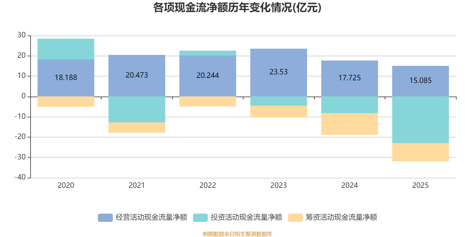 2025年,公司经营活动现金流净额为15.08亿元,同比下降14.9%;筹资活动现金流净额-8.97亿元,同比增加1.68亿元;投资活动现金流净额-22.94亿元,上年同期为-8.23亿元。