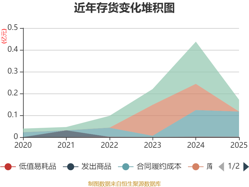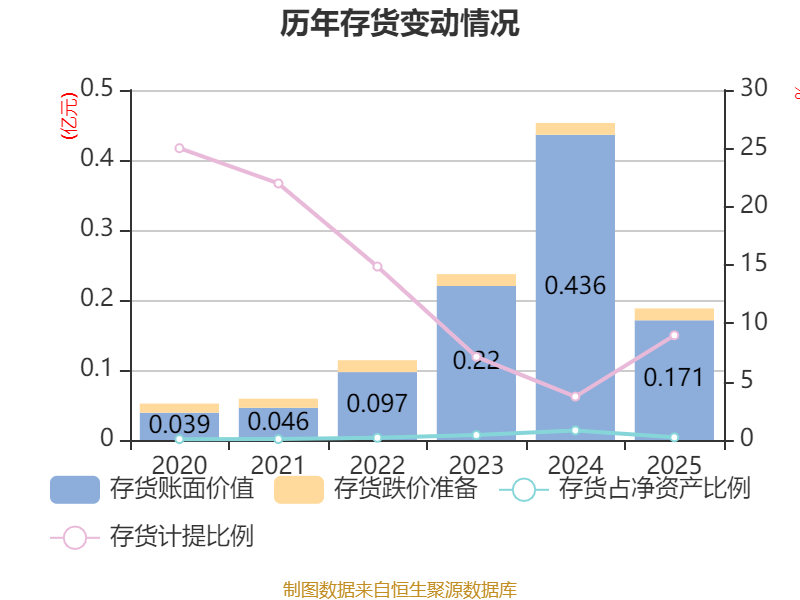 从存货变动来看,截至2025年末,公司存货账面价值为1712.11万元,占净资产的0.23%,较上年末减少2651.18万元。其中,存货跌价准备为168.77万元,计提比例为8.97%。
