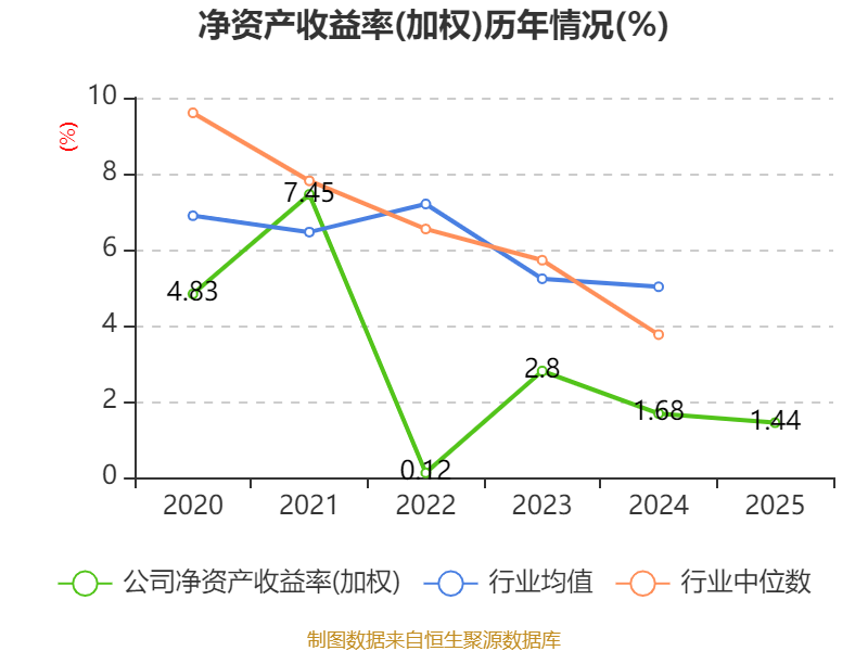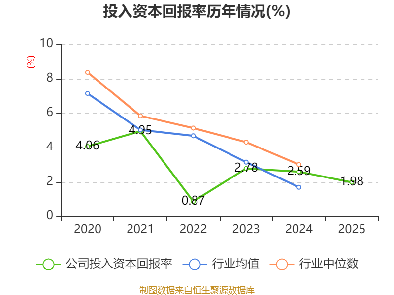 数据显示,2025年公司加权平均净资产收益率为1.44%,较上年同期下降0.24个百分点。公司2025年投入资本回报率为1.98%,较上年同期下降0.61个百分点。