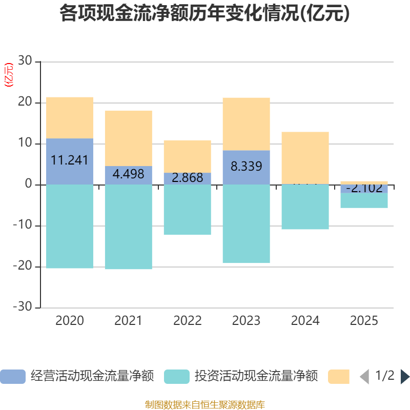 截至2025年,公司经营活动现金流净额为-2.1亿元,同比减少2.23亿元;筹资活动现金流净额7824.79万元,同比减少11.91亿元;投资活动现金流净额-3.62亿元,上年同期为-10.92亿元。