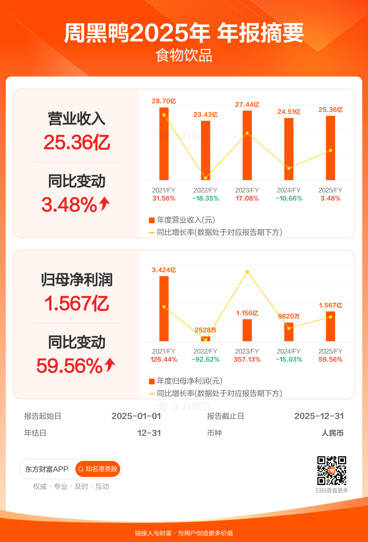 周黑鸭3月26日发布年报业绩,截至2025年12月31日的12个月内,该公司营业收入25.36亿人民币,同比增长3.48%;公司权益持有人应占溢利(归母净利润)1.57亿人民币,同比增长59.56%,低于机构一致预测的1.96亿人民币。