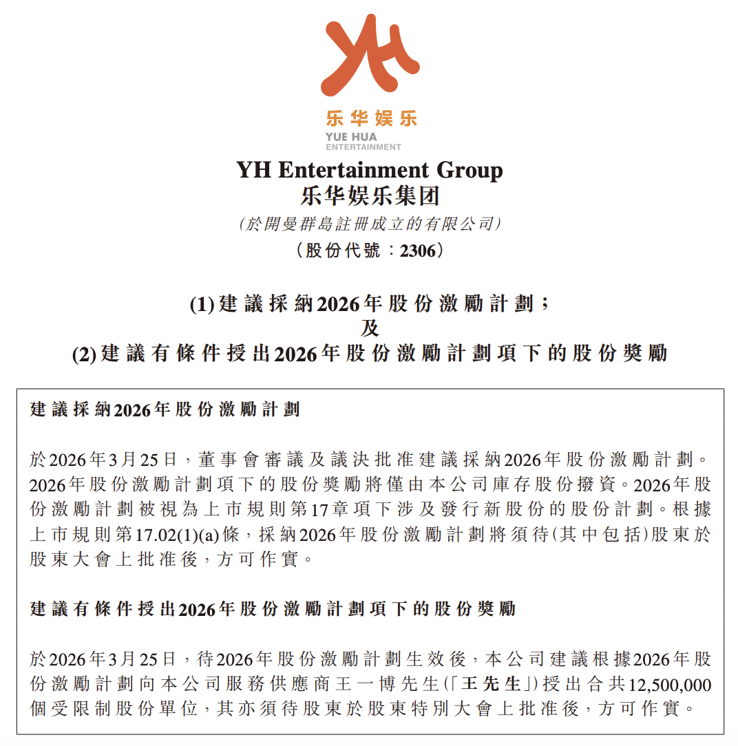 公告显示,通过提供股权激励,公司寻求维持与王一博的长期合作以支持其于艺术才华、行业专业知识及公众影响力方面的持续增长,从而确保集团持续获益。董事会认为,王一博集专业技能、创意成就及社会影响力于一身,这一独到之处使其成为公司不可替代的资产。因此,建议授予被视为维持与王一博长期合作的战略措施,同时向其他服务供应商展示公司致力于表彰杰出贡献。
