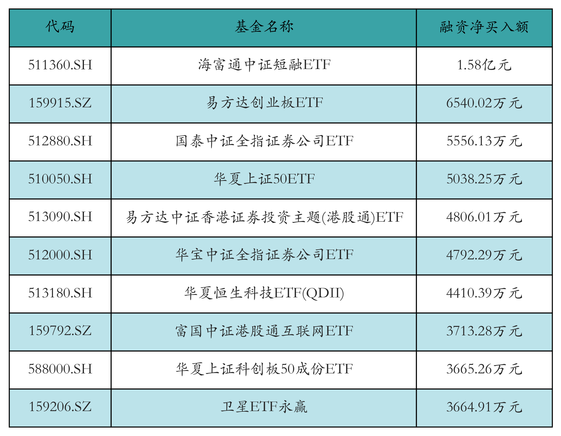 3月26日ETF融资净买入额前三位分别为:海富通中证短融ETF(1.58亿元)、易方达创业板ETF(6540.02万元)和国泰中证全指证券公司ETF(5556.13万元),前10具体见下表: