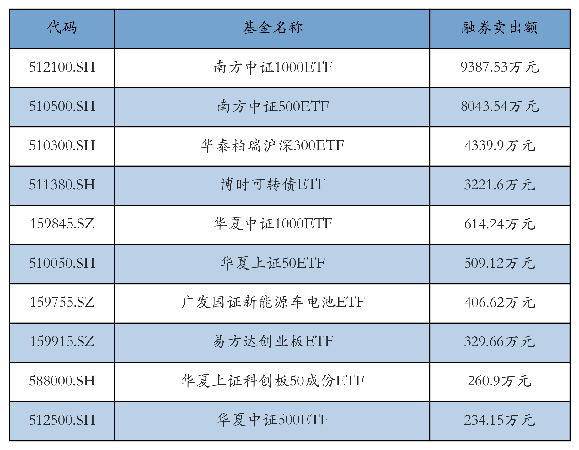 3月26日ETF融券卖出额前三位分别为:南方中证1000ETF(9387.53万元)、南方中证500ETF(8043.54万元)和华泰柏瑞沪深300ETF(4339.9万元),前10具体见下表: