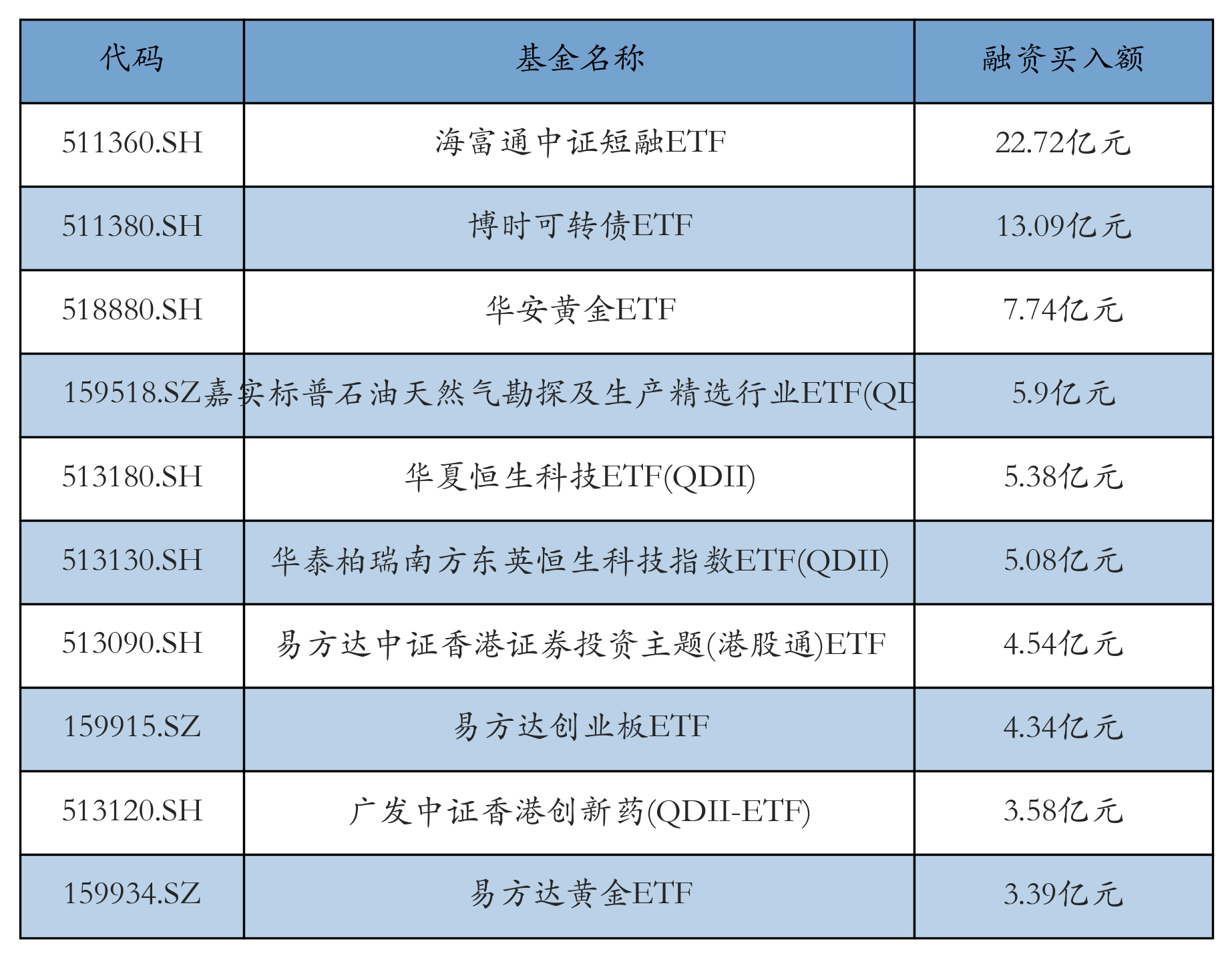 3月26日ETF融资买入额前三位分别为:海富通中证短融ETF(22.72亿元)、博时可转债ETF(13.09亿元)和华安黄金ETF(7.74亿元),前10具体见下表: