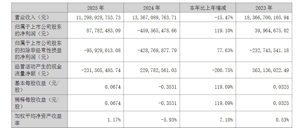 2024年还亏损高达4.59亿元的天原股份在2025年盈利能力明显回升,业绩顺利扭亏。根据公司最新发布的2025年年报来看,公司全年实现营业收入112.99亿元,同比下降15.47%;实现归母净利润为8778.25万元,同比增长119.1%;实现扣非归母净利润为亏损9592.90万元,同比减亏77.63%;基本每股收益0.07元。