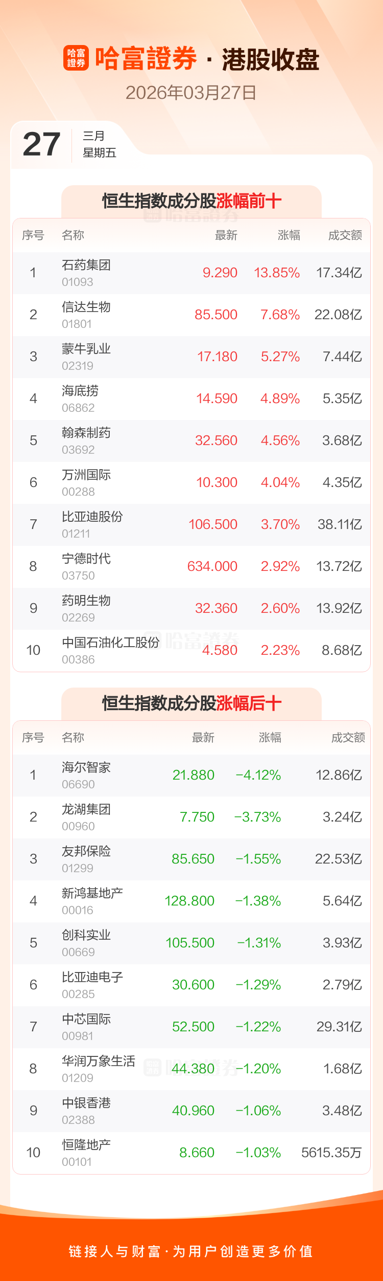 港股3月27日收盘走高,恒生指数收报24951.88点,涨95.45点,涨幅0.38%;恒生科技指数收报4778.01点,涨16.47点,涨幅0.35%。恒生指数成分股中石药集团、信达生物、蒙牛乳业涨幅居前,海尔智家、龙湖集团、友邦保险跌幅靠前。恒生科技指数成分股中零跑汽车、比亚迪股份、京东健康涨幅居前,海尔智家、蔚来-SW、哔哩哔哩-W跌幅靠前。