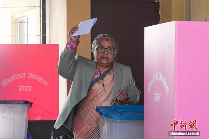 3月5日,尼泊尔临时政府总理卡尔基在加德满都一投票站完成投票。中新社记者崔楠摄
