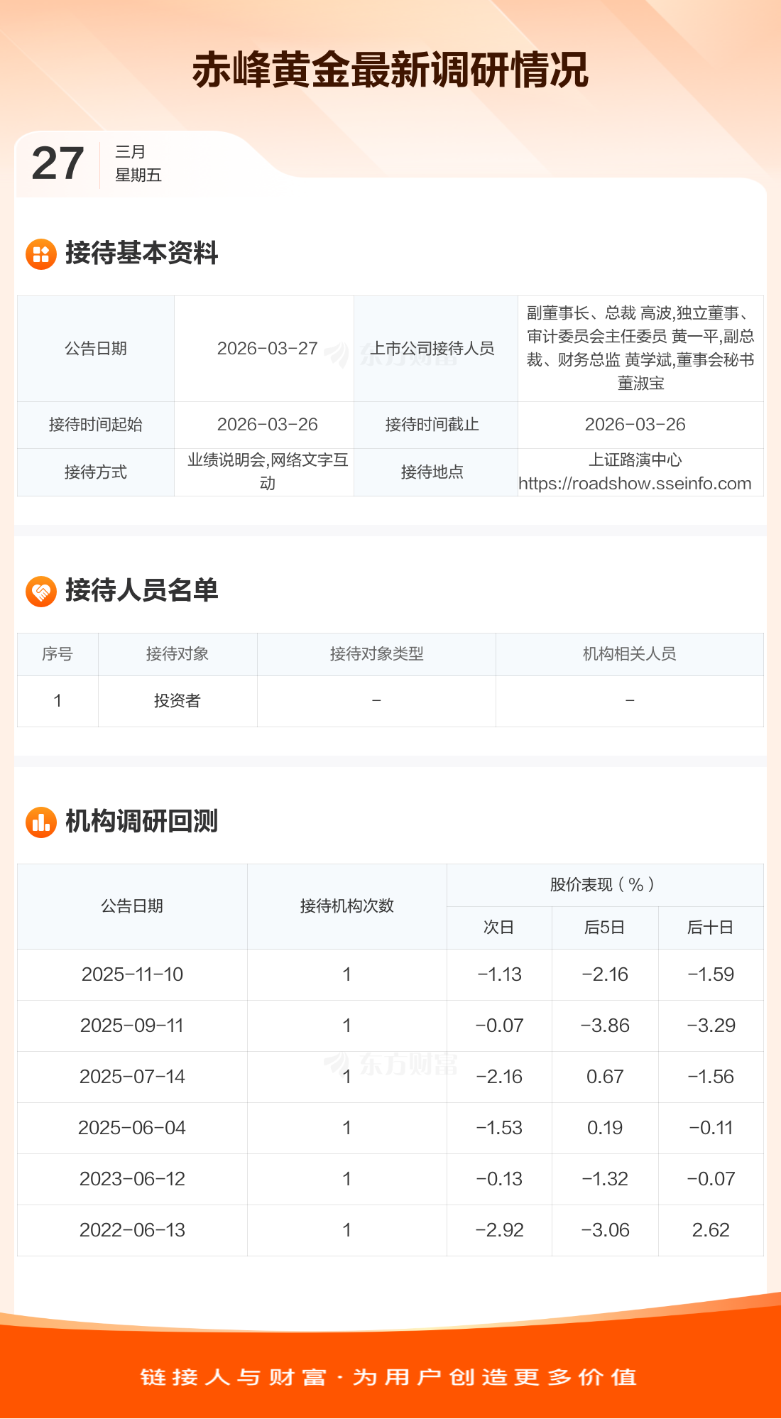 赤峰黄金3月27日公告称,3月26日接待投资者等1家机构调研。接待人员包括副董事长、总裁 高波,独立董事、审计委员会主任委员 黄一平,副总裁、财务总监 黄学斌,董事会秘书 董淑宝。