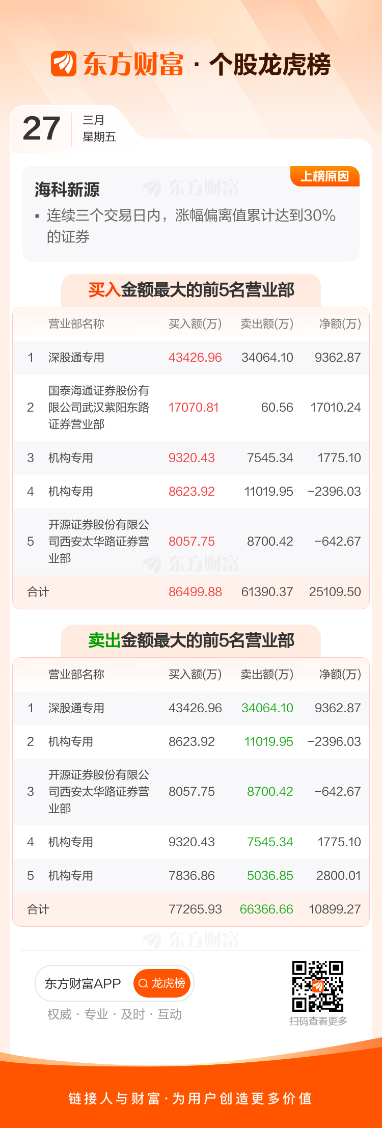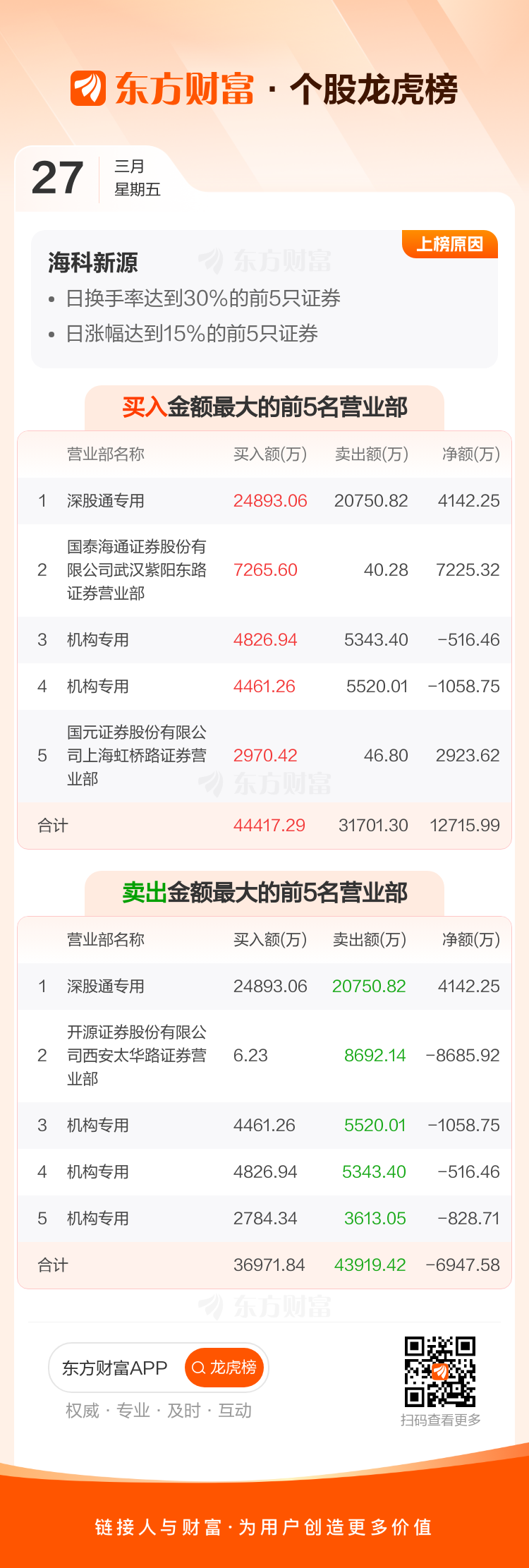 交易所2026年3月27日公布的交易公开信息显示,海科新源因成为日换手率达到30%的前5只证券、日涨幅达到15%的前5只证券、连续三个交易日内,涨幅偏离值累计达到30%的证券上榜。海科新源当日收报96.29元,涨跌幅20.00%,偏离值36.14%,换手率36.20%,成交额27.11亿。异常期间3月26日至3月27日,期间涨幅39.53%,累计偏离值39.85%,区间成交额52.63亿。