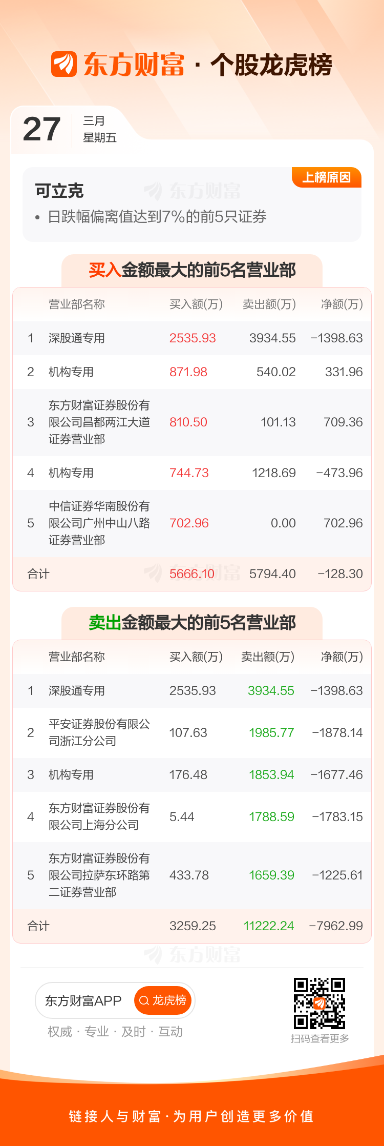 交易所2026年3月27日公布的交易公开信息显示,可立克因成为日跌幅偏离值达到7%的前5只证券上榜。可立克当日收报23.54元,涨跌幅-10.02%,偏离值-11.29%,换手率6.45%,成交额7.47亿。