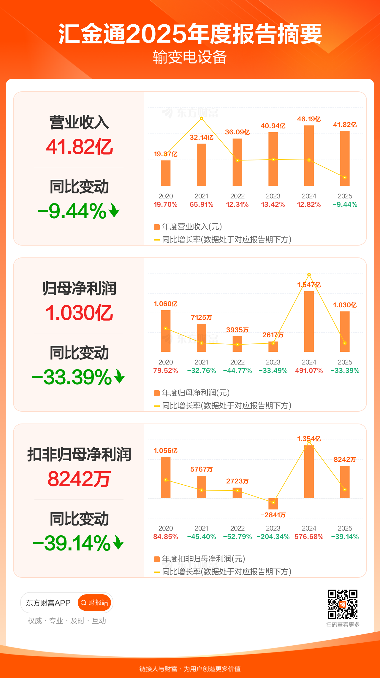 汇金通3月28日发布2025年年报显示,公司全年实现营业收入41.82亿元,同比下滑9.44%;归母净利润1.03亿元,同比下滑33.39%;扣非归母净利润8241.60万元,同比下滑39.14%。