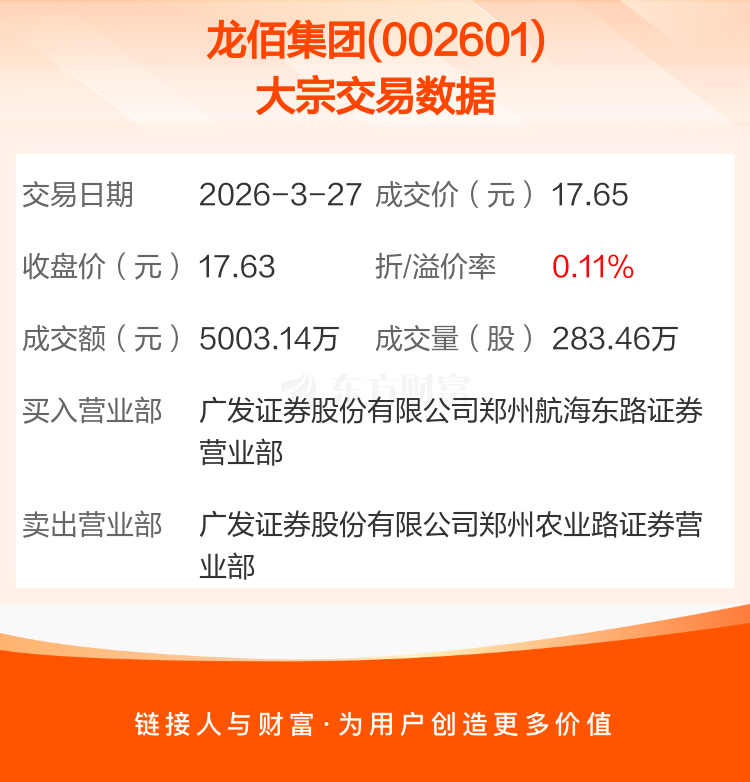2026年3月27日,龙佰集团发生1笔大宗交易,共成交283.46万股,成交金额5003.14万元,占其流通市值比例为0.14%。
