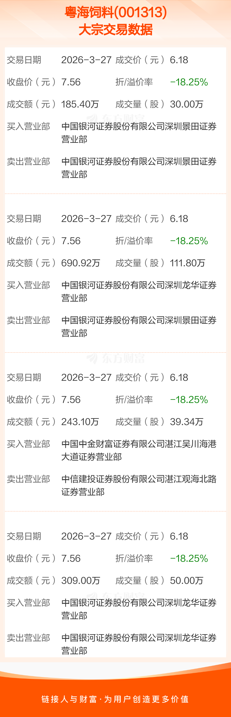 2026年3月27日,粤海饲料发生4笔大宗交易,共成交231.14万股,成交金额1428.42万元,占其流通市值比例为0.27%。