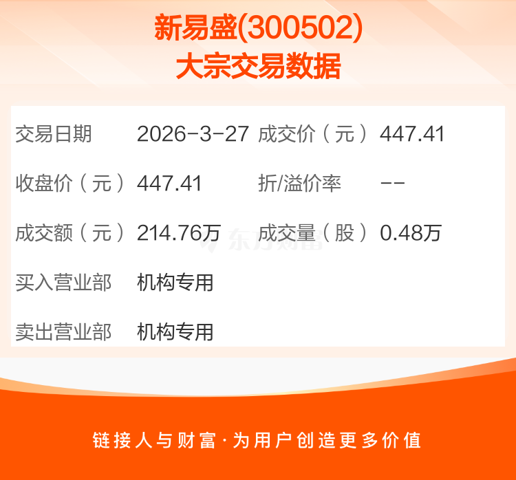 2026年3月27日,新易盛发生1笔大宗交易,共成交4800股,成交金额214.76万元。