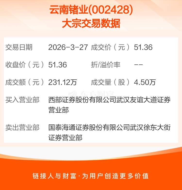2026年3月27日,云南锗业发生1笔大宗交易,共成交4.50万股,成交金额231.12万元。