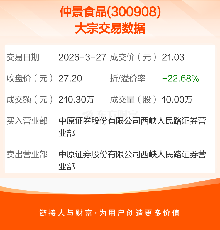 2026年3月27日,仲景食品发生1笔大宗交易,共成交10.00万股,成交金额210.30万元,占其流通市值比例为0.06%。