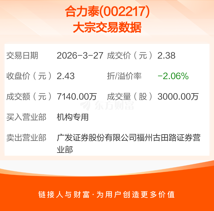 2026年3月27日,合力泰发生1笔大宗交易,共成交3000.00万股,成交金额7140.00万元,占其流通市值比例为0.40%。