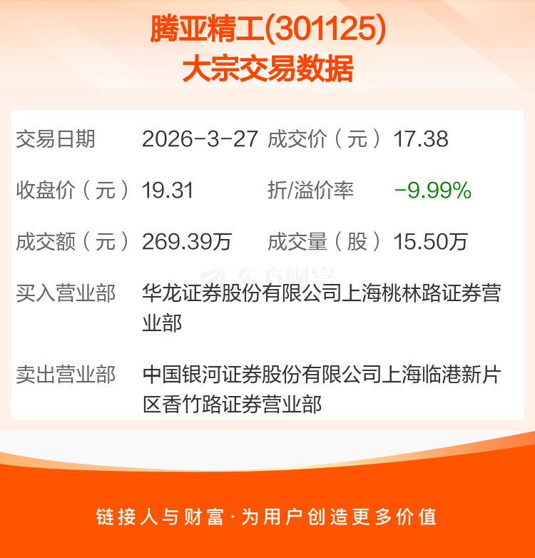 大宗交易:腾亚精工成交269.39万元,折价9.99%(3-27)