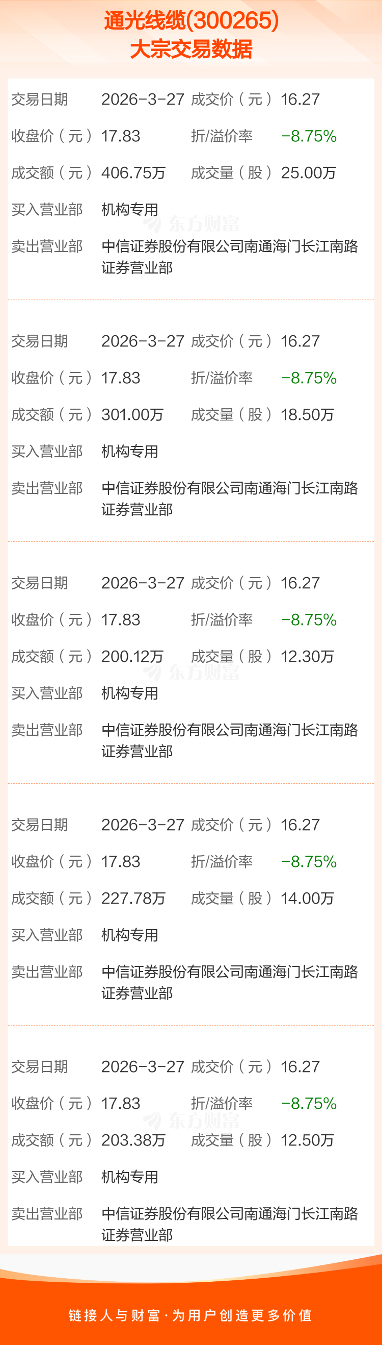 大宗交易:通光线缆成交1339.03万元,折价8.75%(3-27)