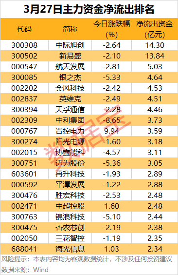 据数据宝统计,23股主力资金净流出均超2亿元,其中,中际旭创、新易盛、航天发展、银之杰、金风科技、英维克、天孚通信、中利集团、晋控电力等净流出金额居前。