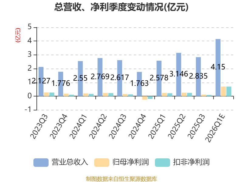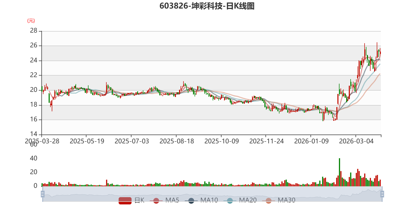 中证智能财讯坤彩科技(603826)3月27日晚间披露业绩预告,预计2026年一季度实现营业收入3.8亿元至4.5亿元,同比增长47.4%-74.56%;归母净利润6000万元至8000万元,同比增长151.56%-235.41%;扣非净利润预计6000万元至8000万元,同比增长177.02%-269.36%。以最新收盘价计算,市净率(LF)约8.46倍,市销率(TTM)约39.77倍。