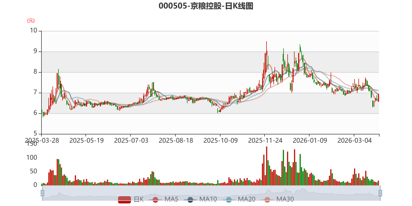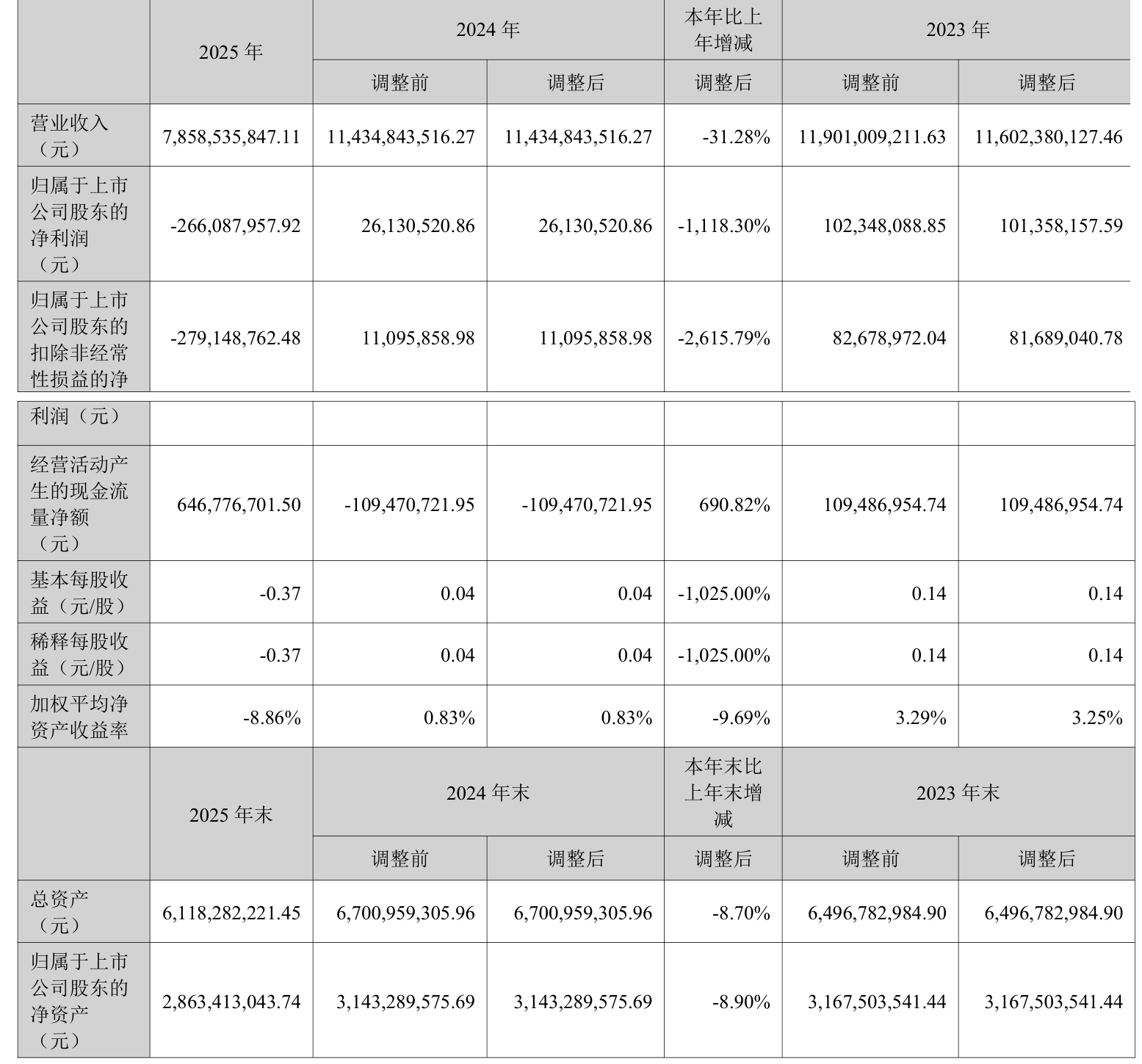中证智能财讯京粮控股(000505)3月28日披露2025年年度报告。2025年,公司实现营业总收入78.59亿元,同比下降31.28%;归母净利润亏损2.66亿元,上年同期盈利2613.05万元;扣非净利润亏损2.79亿元,上年同期盈利1109.59万元;经营活动产生的现金流量净额为6.47亿元,上年同期为-1.09亿元;报告期内,京粮控股基本每股收益为-0.37元,加权平均净资产收益率为-8.86%。