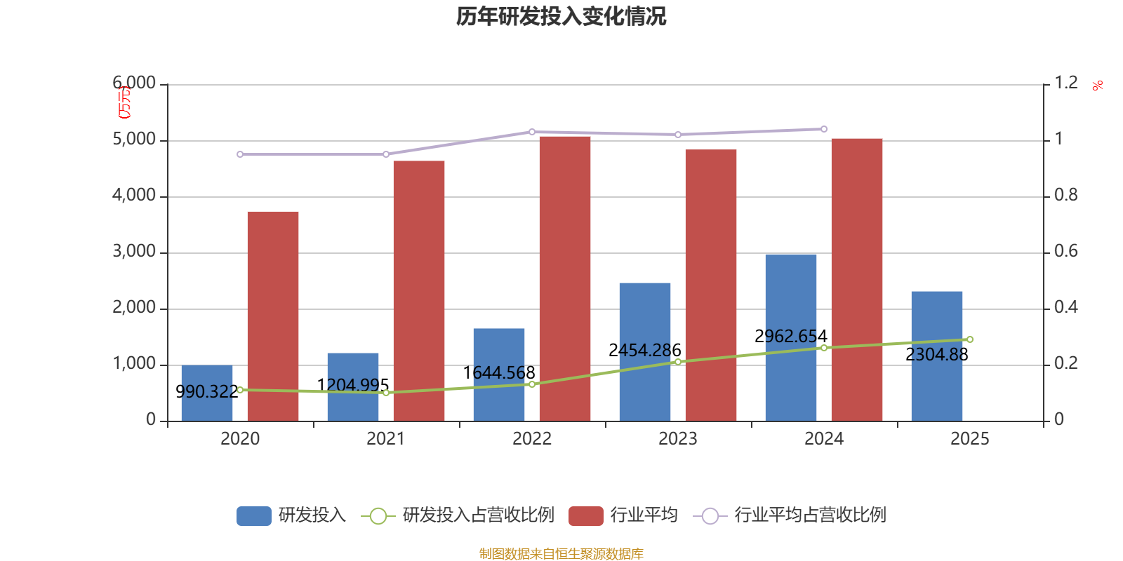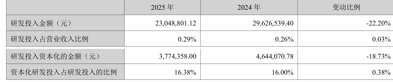 2025年全年,公司研发投入金额为2304.88万元,同比下降22.2%;研发投入占营业收入比例为0.29%,相比上年同期上升0.03个百分点。此外,公司全年研发投入资本化率为16.38%。