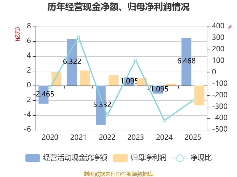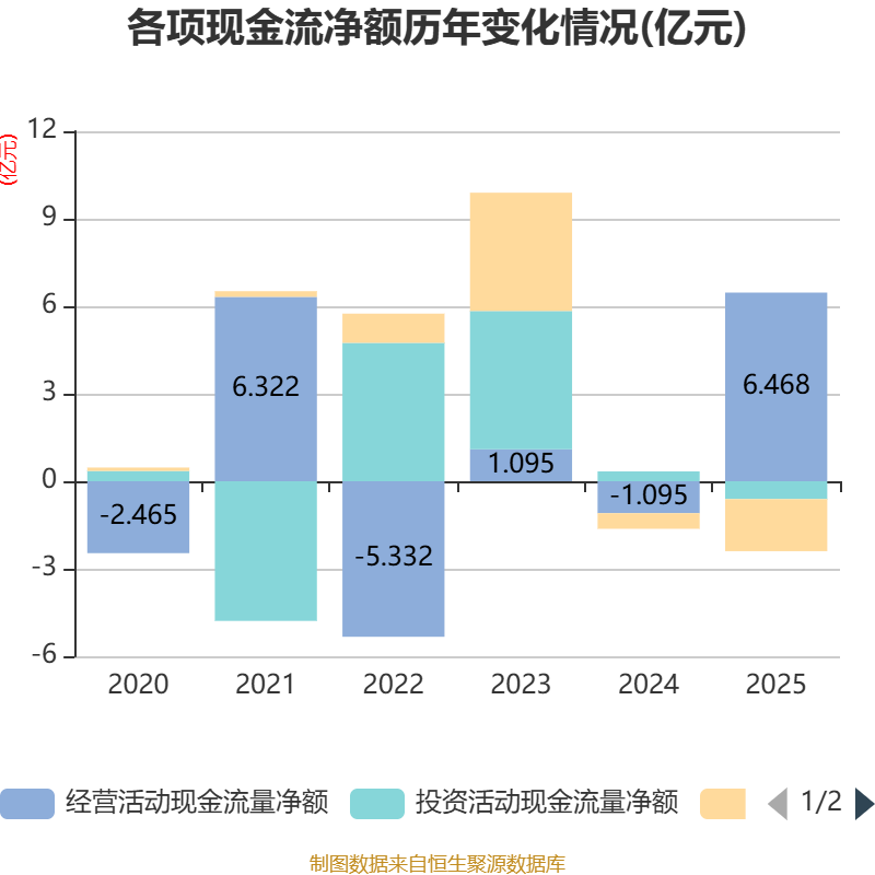 截至2025年,公司经营活动现金流净额为6.47亿元,同比增加7.56亿元;筹资活动现金流净额-1.79亿元,同比减少1.25亿元;投资活动现金流净额-6116万元,上年同期为3374.7万元。