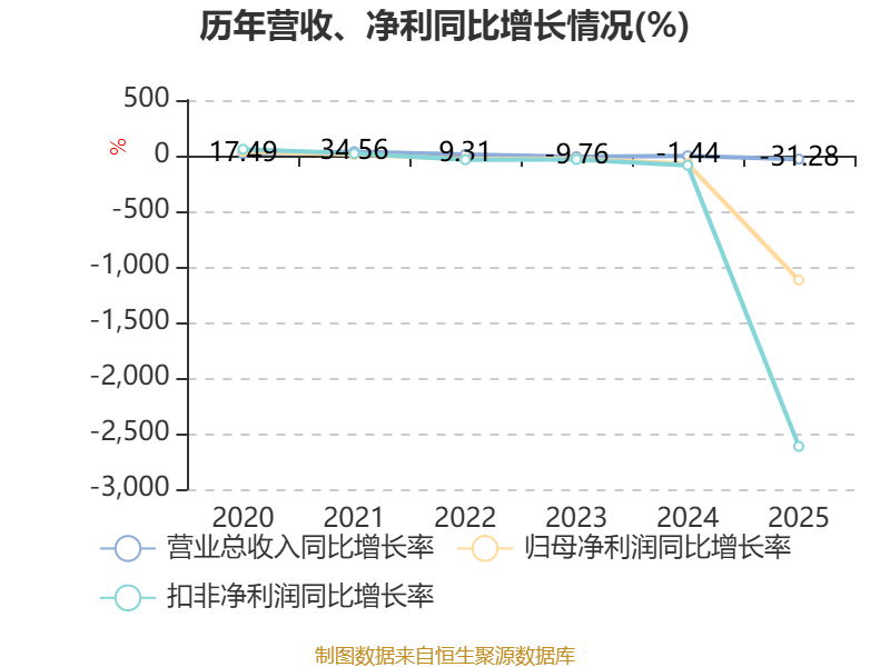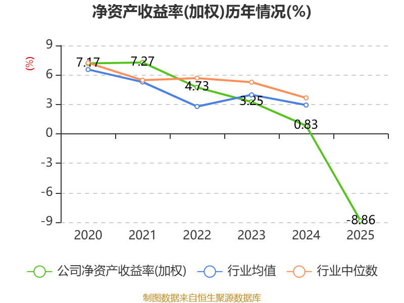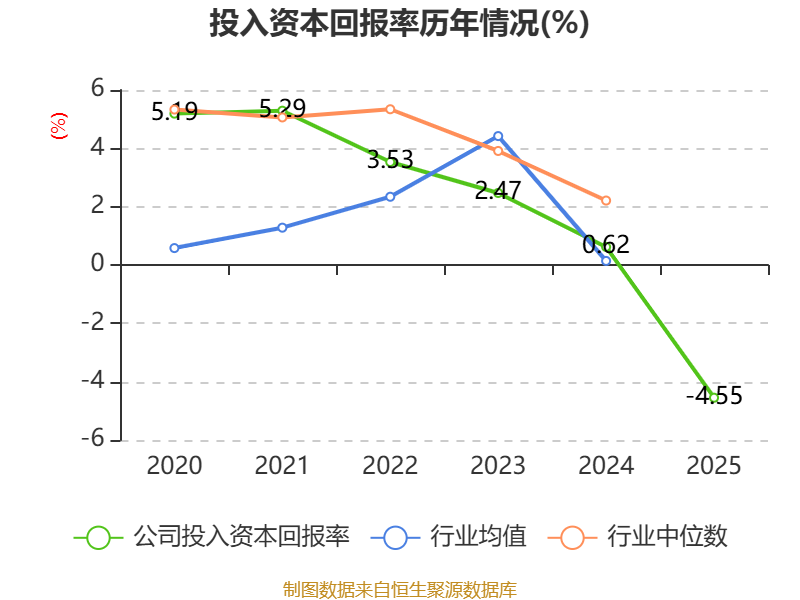 数据显示,2025年公司加权平均净资产收益率为-8.86%,较上年同期下降9.69个百分点。公司2025年投入资本回报率为-4.55%,较上年同期下降5.17个百分点。