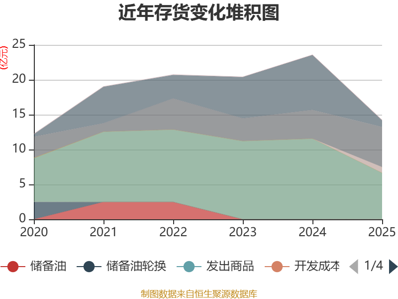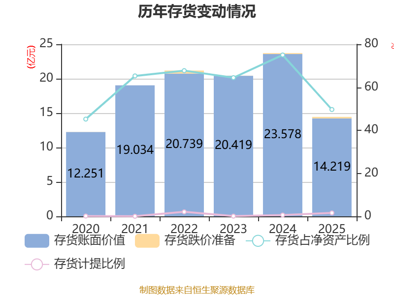 从存货变动来看,截至2025年末,公司存货账面价值为14.22亿元,占净资产的49.66%,较上年末减少9.36亿元。其中,存货跌价准备为2291.9万元,计提比例为1.59%。