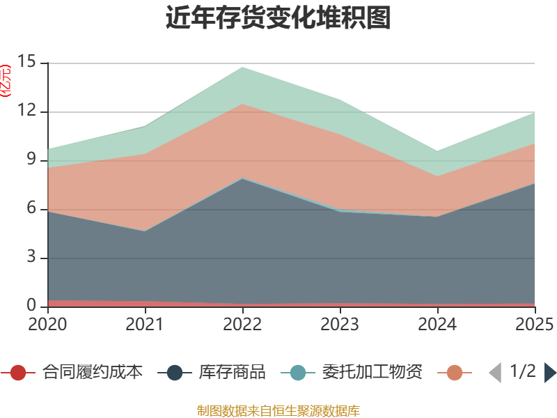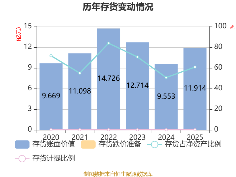 从存货变动来看,截至2025年末,公司存货账面价值为11.91亿元,占净资产的60.76%,较上年末增加2.36亿元。公司本期没有计提存货跌价准备。
