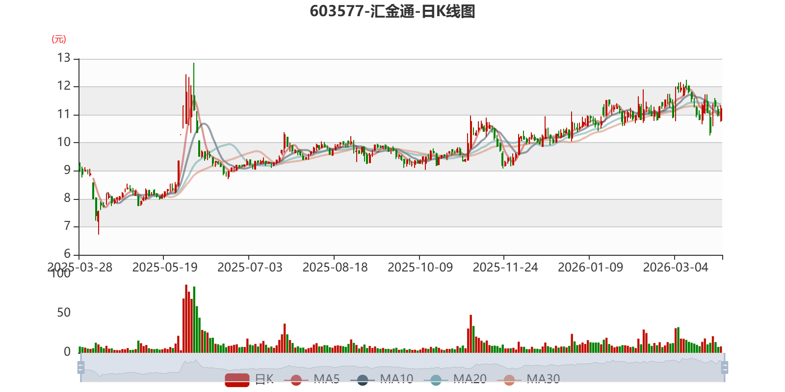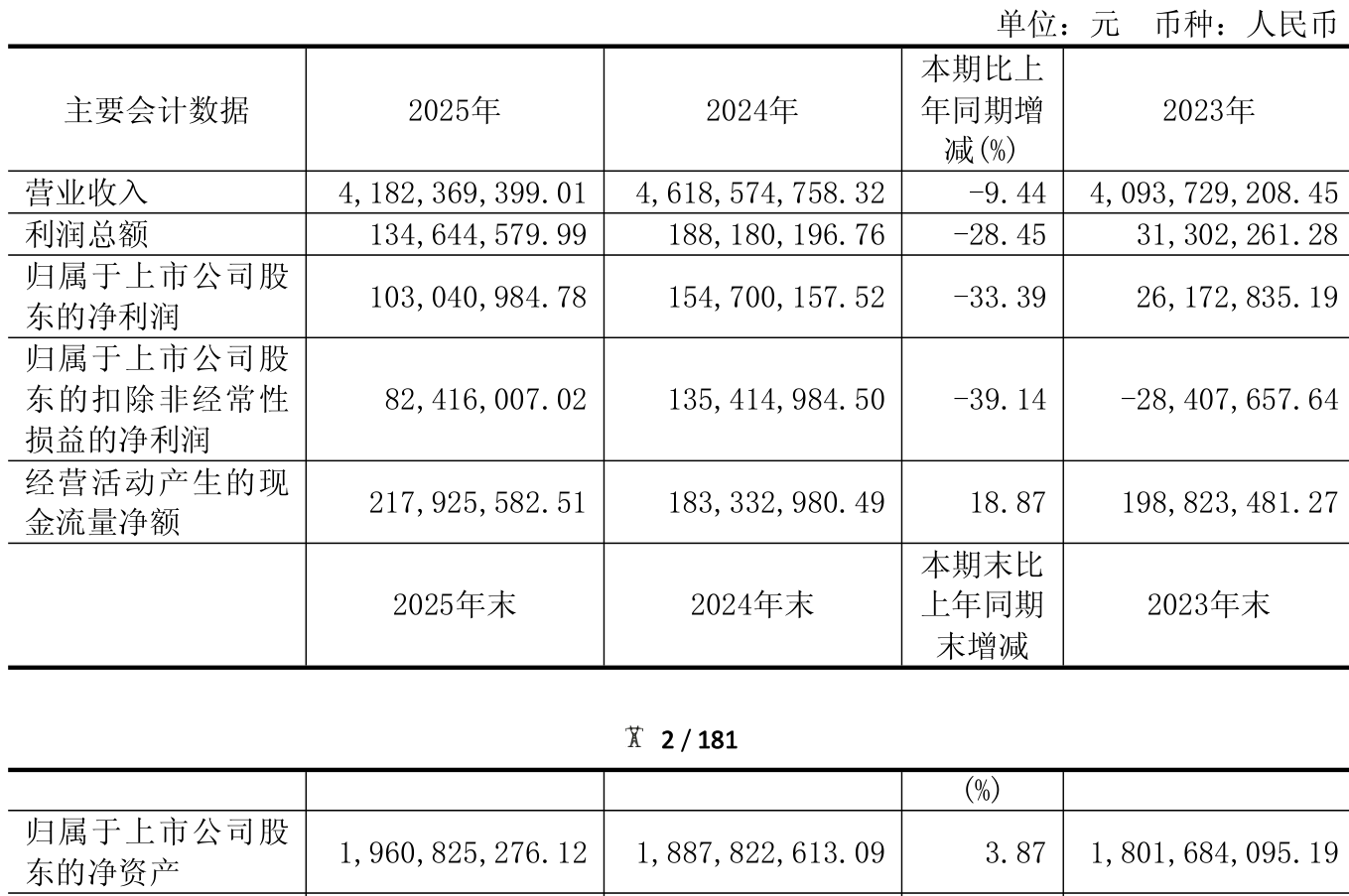 中证智能财讯汇金通(603577)3月28日披露2025年年度报告。2025年,公司实现营业总收入41.82亿元,同比下降9.44%;归母净利润1.03亿元,同比下降33.39%;扣非净利润8241.6万元,同比下降39.14%;经营活动产生的现金流量净额为2.18亿元,同比增长18.87%;报告期内,汇金通基本每股收益为0.3038元,加权平均净资产收益率为5.36%。公司2025年度分配预案为:拟向全体股东每10股派现0.608元(含税)。