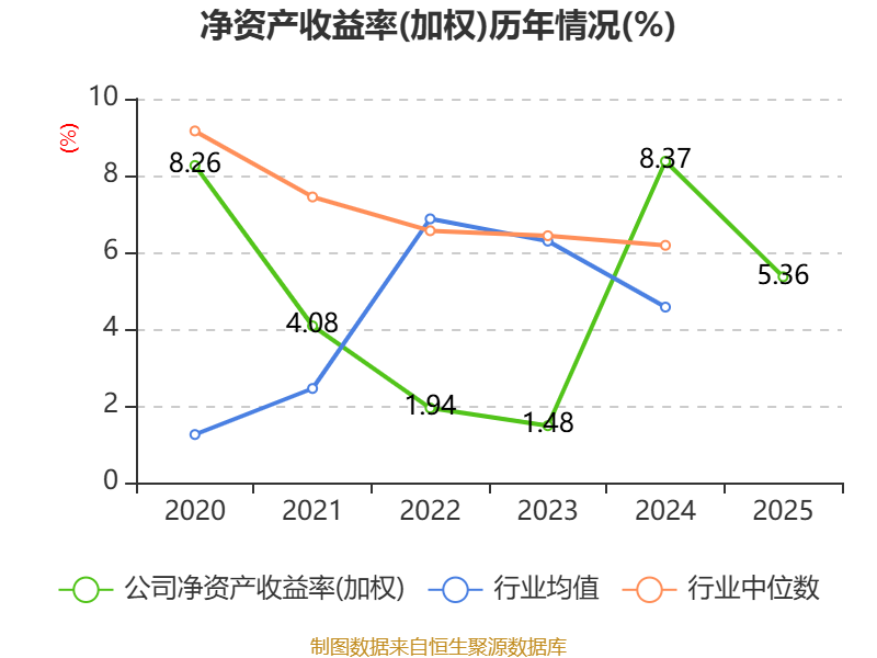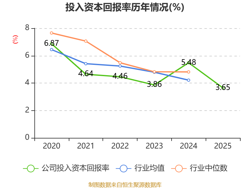 数据显示,2025年公司加权平均净资产收益率为5.36%,较上年同期下降3.01个百分点。公司2025年投入资本回报率为3.65%,较上年同期下降1.83个百分点。