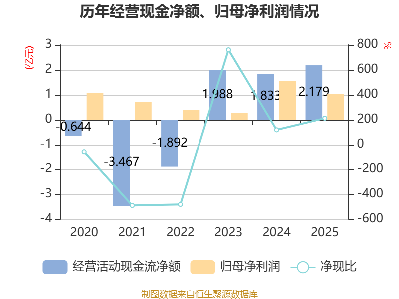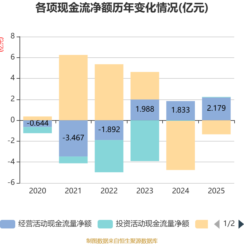 截至2025年,公司经营活动现金流净额为2.18亿元,同比增长18.87%;筹资活动现金流净额-1.34亿元,同比增加3.35亿元;投资活动现金流净额544.93万元,上年同期为-585.64万元。