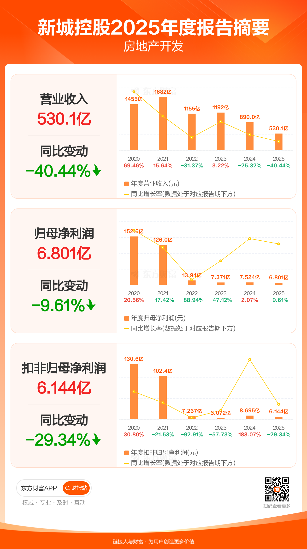 新城控股3月28日发布2025年年报显示,公司全年实现营业收入530.12亿元,同比下滑40.44%;归母净利润6.80亿元,同比下滑9.61%;扣非归母净利润6.14亿元,同比下滑29.34%。