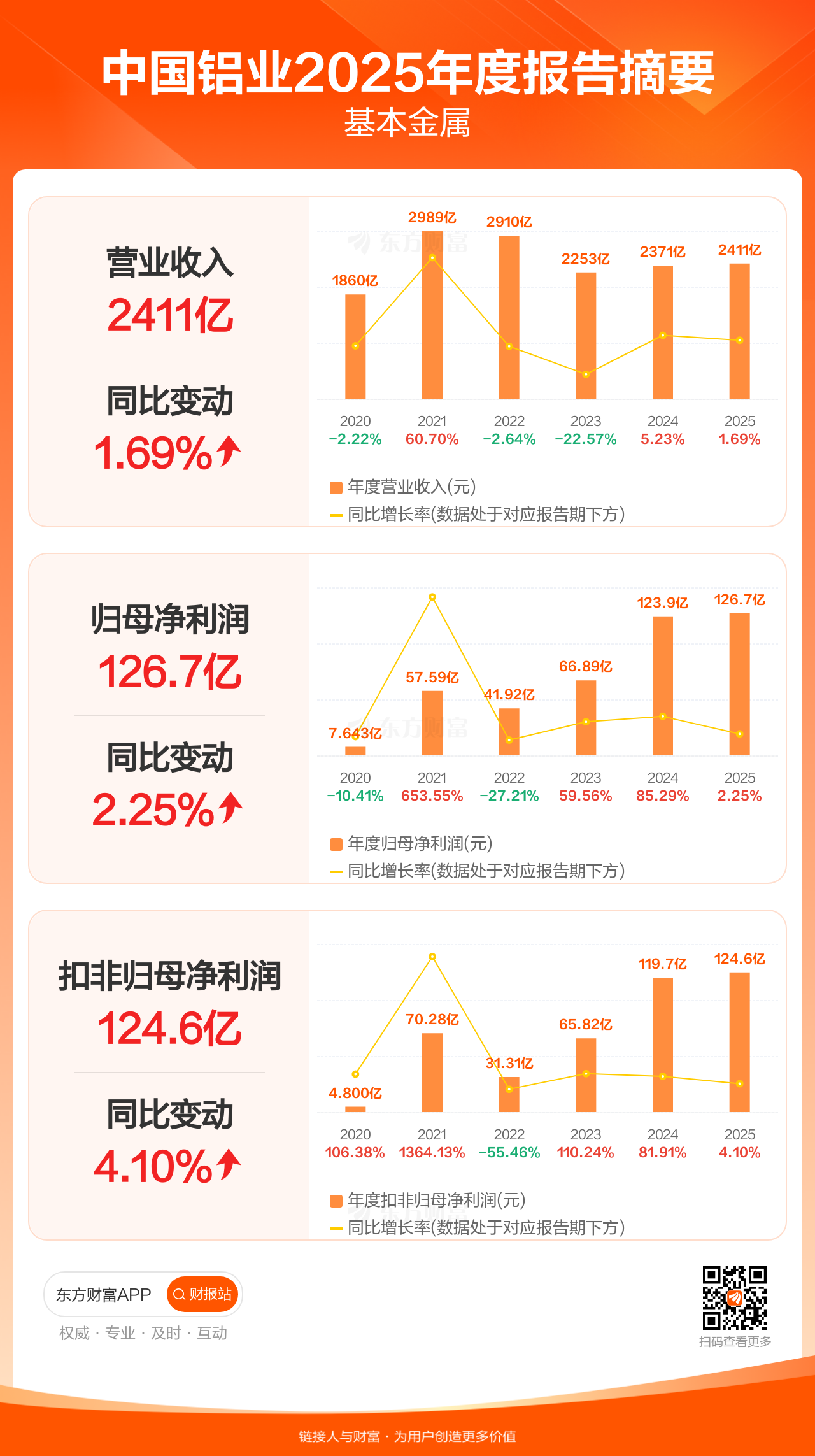 中国铝业3月28日发布2025年年报显示,公司全年实现营业收入2411.25亿元,同比增长1.69%;归母净利润126.74亿元,同比增长2.25%;扣非归母净利润124.64亿元,同比增长4.10%。